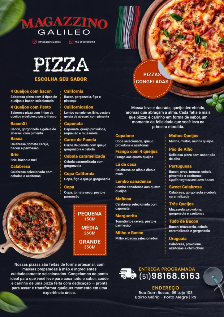 Pizzas, lasanhas, nhoque de forno, batatas gratinadas, parmegianas, quiches. Tudo pronto para ir ao forno. Praticidade que derrete no sabor.s