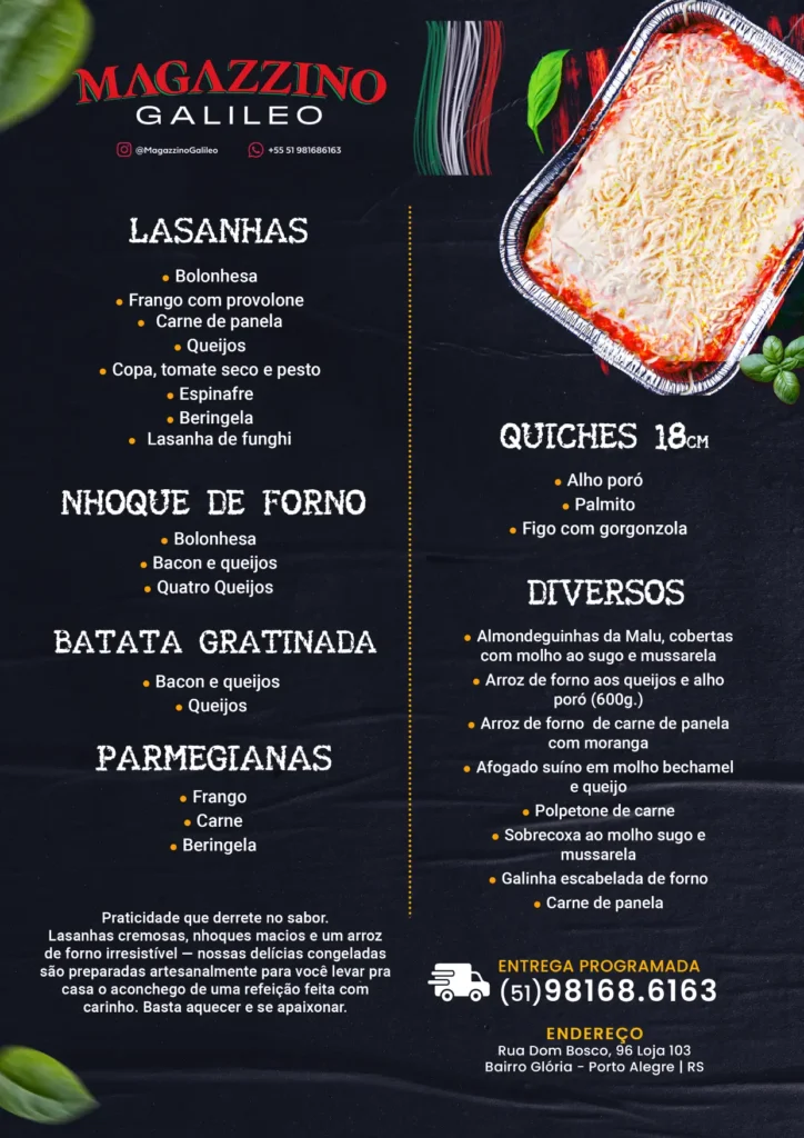 Lasanha Deliciosa, Pronta em Minutos. Escolha seu sabor favorito, aqueça e desfrute de uma refeição gourmet no conforto de casa. Peça agora e descubra o seu novo vício!